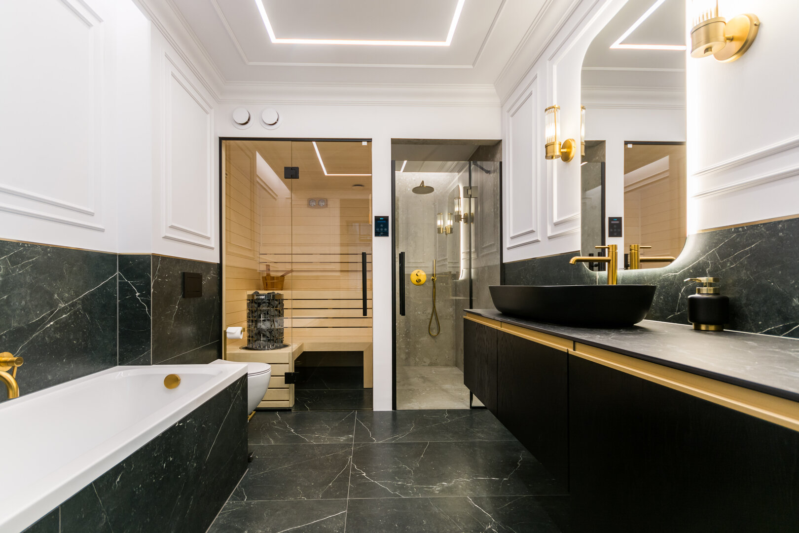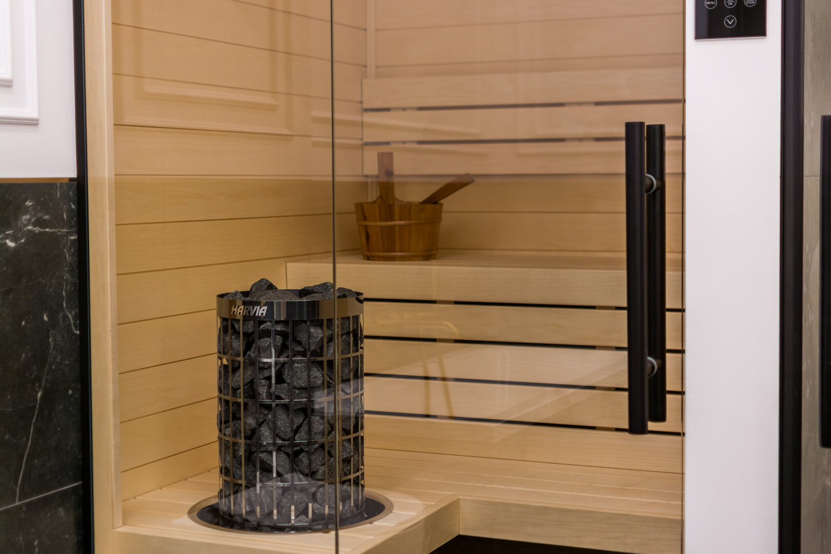 A centrally located apartment with a private sauna and parking. Two bedrooms, a living room with a kitchenette, and a bathroom with a large, comfortable bathtub and a shower.