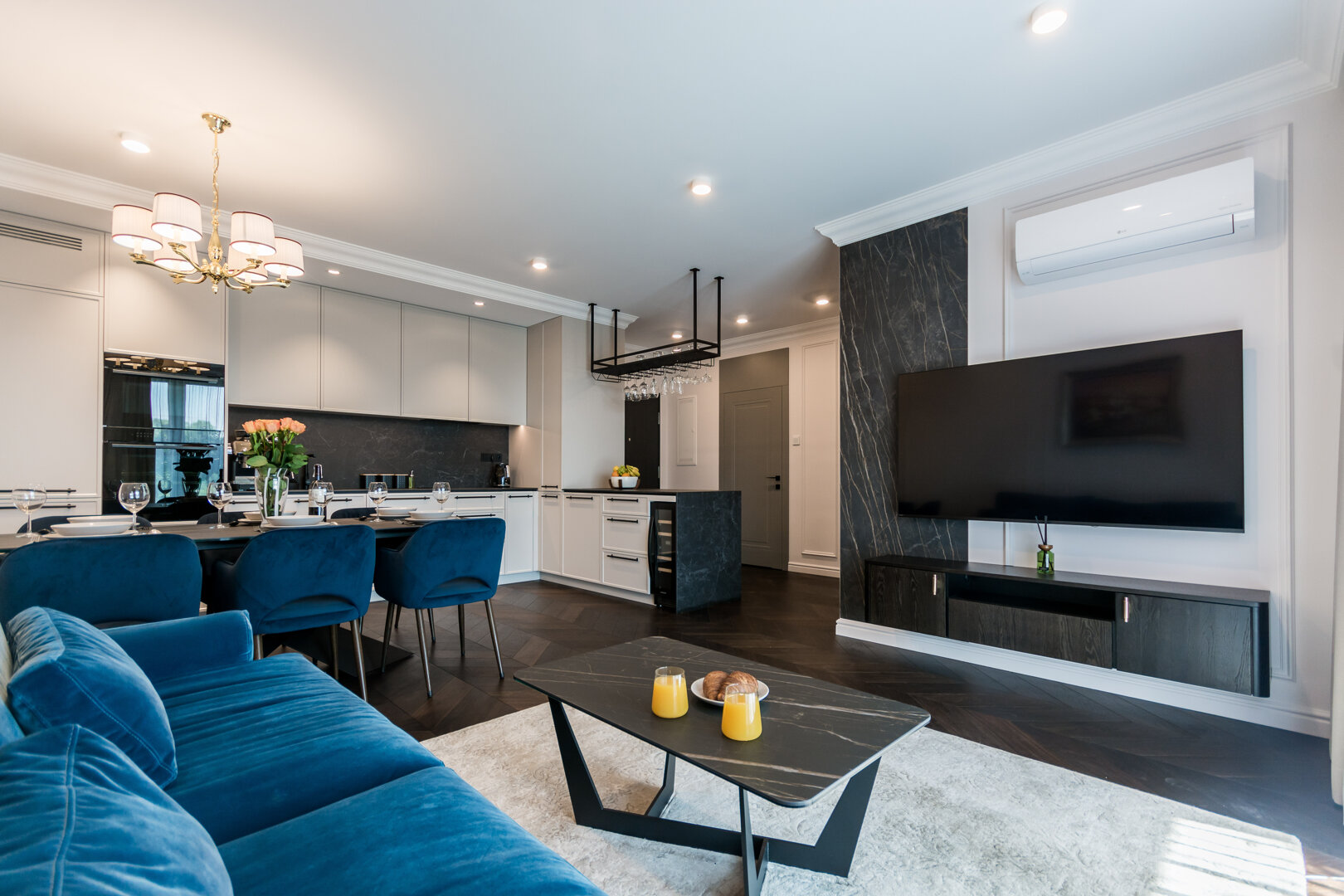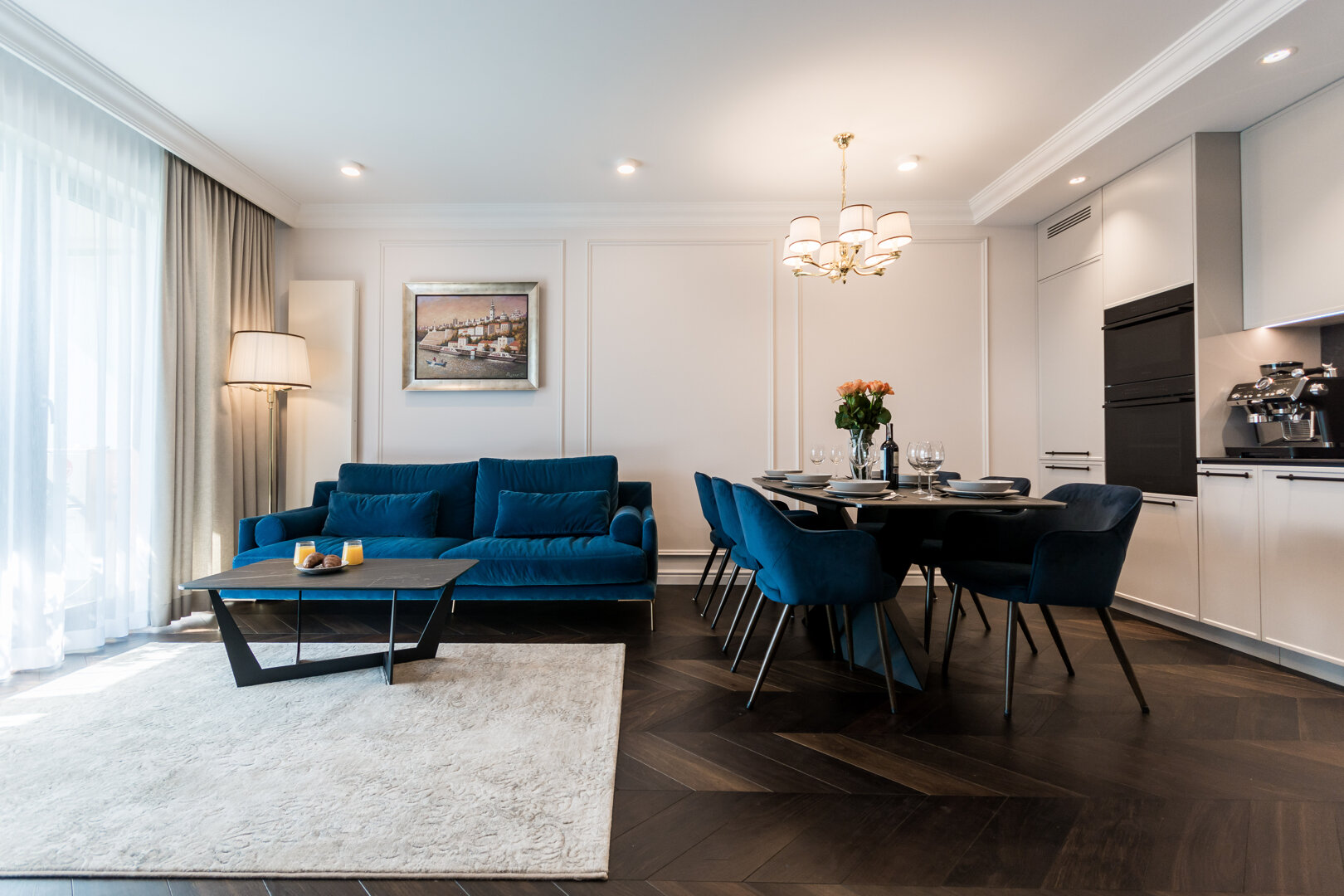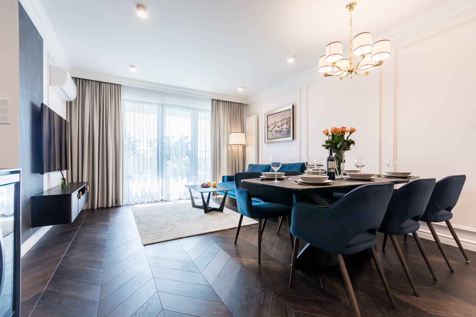 Address: Augustiańska Street 24, Kraków A modern building with a lift, a private parking (for an extra fee) and 24h security. Air-conditioned, two-level penthouse. 3 bedrooms, living room with a kitchenette, terrace, balcony.